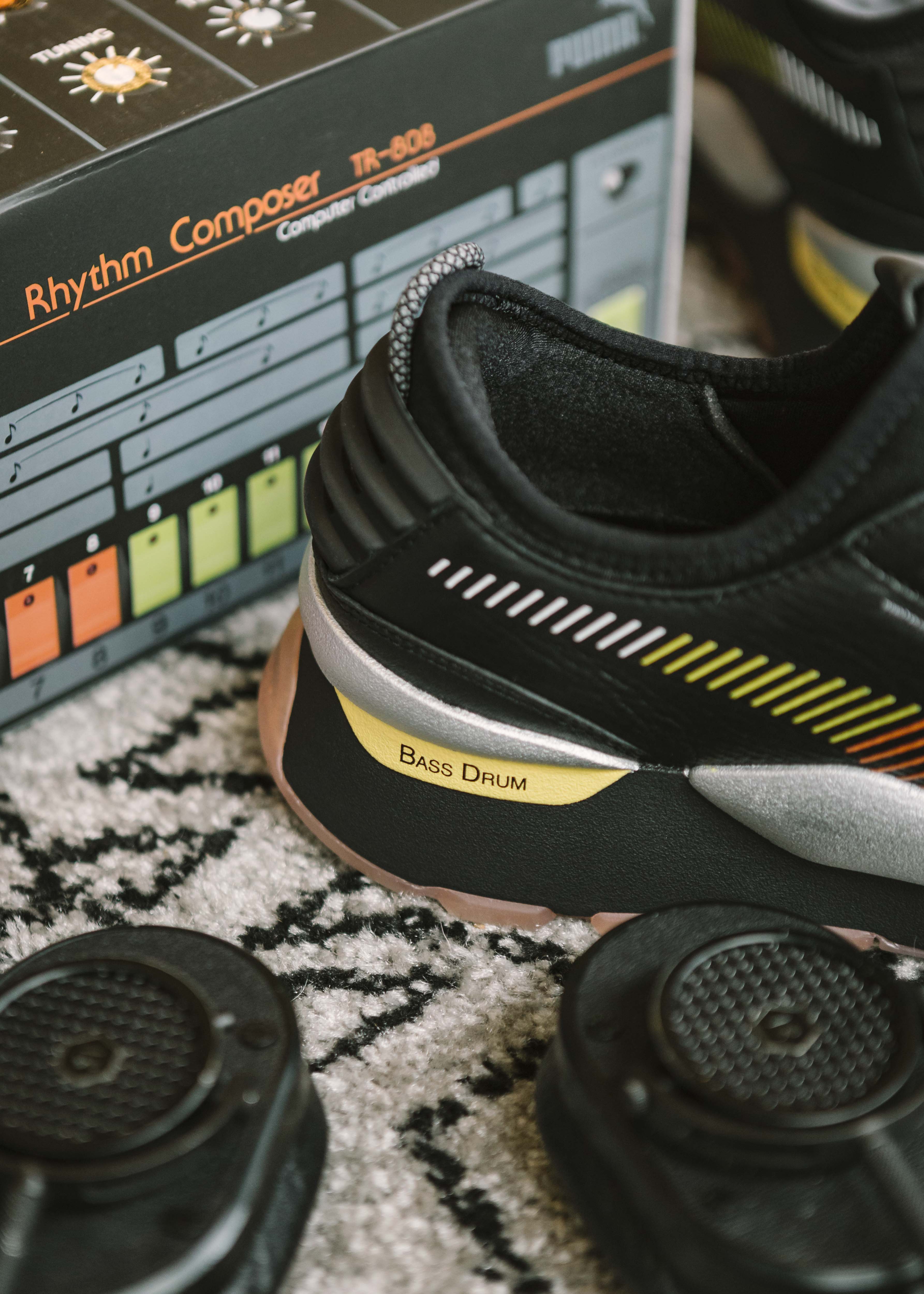 The RS-0 Roland is crafted from a premium leather black upper with perforated vents. It is completed with flat, reflective laces, reflective midsole details, and signature TR-808 colors: red, orange, and yellow on the formstrip. The sneaker is flanked with the words “Rhythm Composer” and “Bass Drum” on the midsole. PUMA and Roland branding can be found on the tongue label, footbed and the anodized metal hangtag.